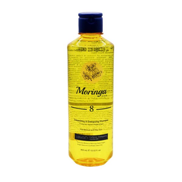 شامپو حجم دهنده و انرژی بخش ۸ مورینگا امو مناسب موهای معمولی و نازک با فرمولاسیون انحصاری تولید شده است. از آنجایی که موها نقش بسیار مهمی در زیبایی ایفا میکنند، کمک گرفتن از مواد طبیعی بهترین راه محسوب میشود. برند مورینگا امو با عرضه محصولاتی مانند شامپو حجم دهنده موهای معمولی و نازک در این زمینه معجزهای به همراه دارد. لافا اویل یکی از ترکیبات اختصاصی این محصول است. این ترکیب انحصاری شامل روغن آرگان، مورینگا، آفتاب گردان و هسته انگور میشود که یک ترکیب لطافت بخش و شفا دهنده هرگونه مشکل و آسیب است. شامپو موهای معمولی و نازک مورینگا موها را پاکسازی نموده و به هیچ عنوان موجب خشکی مو نمیشود. همچنین با رطوبت رسانی عمقی، تغذیه و استحکام بخشی انرژی لازم برای احیای مو را فراهم میکند. به همین دلیل استفاده از این شامپو یکی از روشهای درمان موهای نازک محسوب میشود.