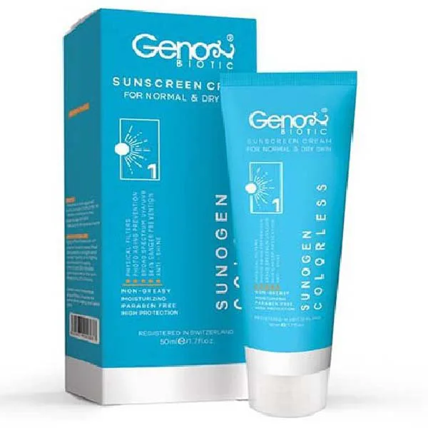 کرم ضد آفتاب سانوژن بی رنگ ژنوبایوتیک SPF50 مناسب پوست خشک و معمولی، با دارا بودن فیلترهای UV و همچنین مواد موثره گیاهی، نقش موثری در مهار اثرات مضر پرتوهای UVA و UVB دارد. بافت این کرم برای پوست های خشک و معمولی طراحی شده، که علاوه بر ایجاد پوشش کامل بر روی پوست، فاقد چربی بوده و با دارا بودن بافت سبک، مانع از انسداد پوستی و تشکیل آکنه میشود.
